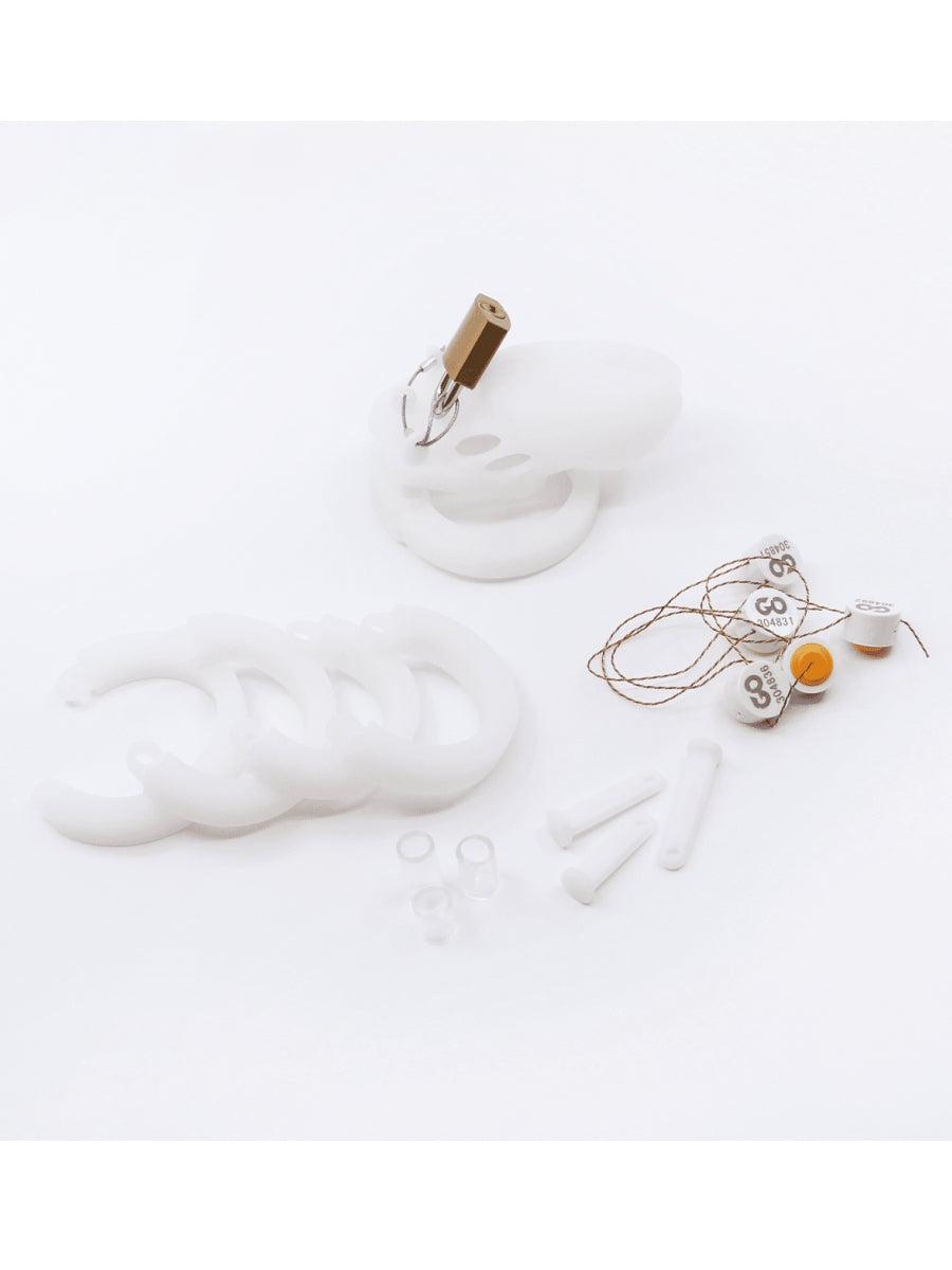 Complete with a customisable system of rings, pins, and spacers, you can dial in the fit that works for you. Brass padlock with keys plus single-use plastic travel locks give you options for at-home play or discreet travel. Beginner friendly and made for long-lasting use.