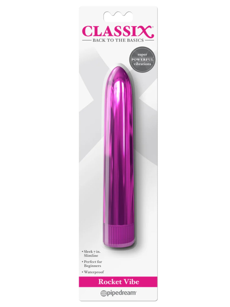 Pipedream Classix Rocket Vibrator Metallic Pink is your sleek 7-inch slimline with a glossy metallic finish and a powerful multi-speed motor that takes you from gentle hum to star-shaking vibes with a twist of the dial.